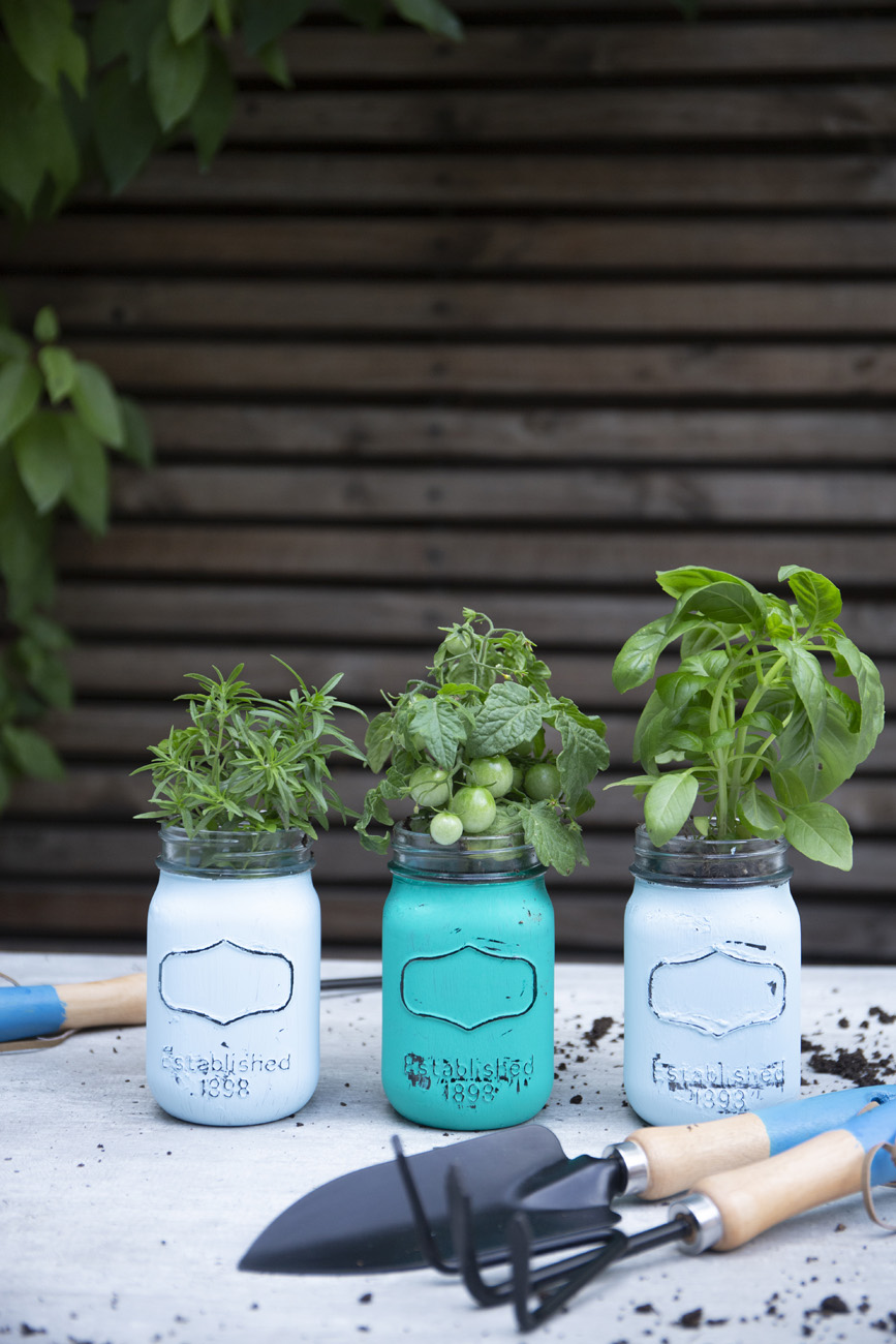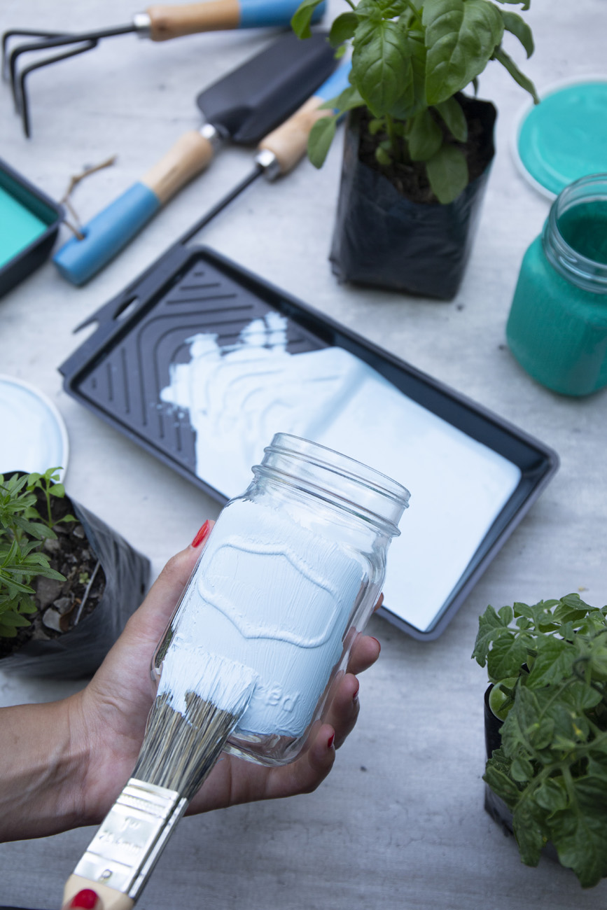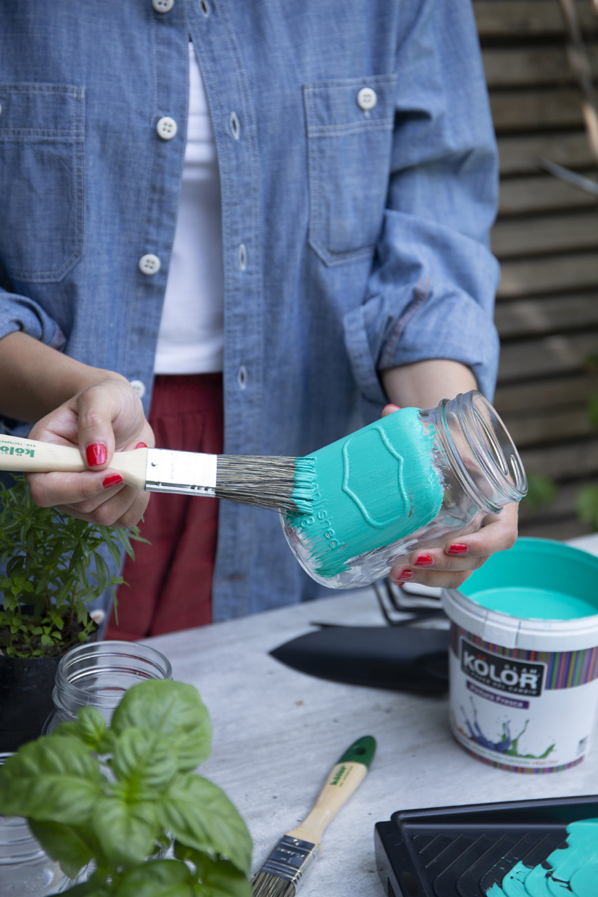 Con una brocha pequeña pinta el primer jarro con el color principal de nuestro proyecto.
