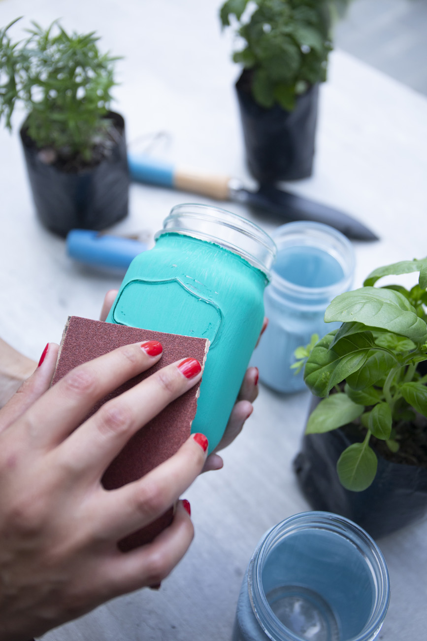 Obtiene un acabado envejecido lijando suavemente la superficie sin desgastar demasiado la pintura, así acentúas los relieves y diseños originales del jarro.